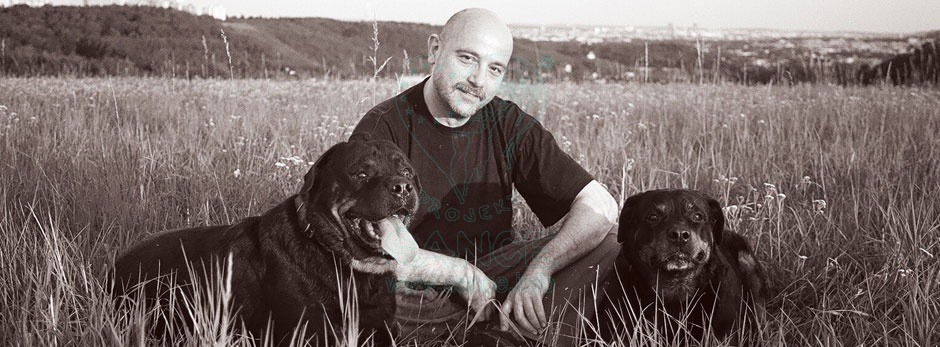 Rotvajler Arnold (vlevo), rotvajlerka Bona (vpravo), László Sümegh (uprostřed)